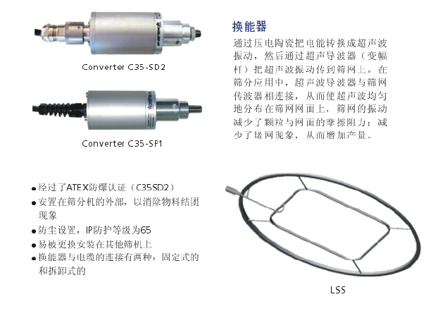 超聲波篩分系統(tǒng)是一種簡單實用、可靠的篩分系統(tǒng),是當(dāng)前解決振動篩在篩選過程中網(wǎng)孔堵塞的方法。并且可增加過篩效率2-3倍之間。廣泛應(yīng)用于食品、制藥、冶金、化工、選礦等要求精細(xì)篩分過濾的行業(yè),篩分過濾精度高,有效的解決因團(tuán)聚、靜電、強(qiáng)吸附性卡網(wǎng)、堵網(wǎng)等難題,是國內(nèi)篩分行業(yè)的一項重大技術(shù)突破。